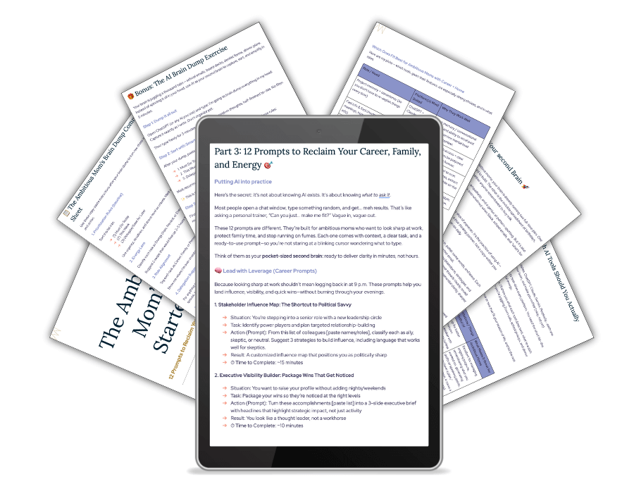 Stop playing small to "protect" your family, passing on bigger roles, and thinking "There's no way I can lead at that level without my home life falling apart". With these tools and transition-focused AI prompts, you reclaim precious hours, tackle the to-dos, and keep family rhythms intact - so when the dream role comes calling, you can say yes with confidence.